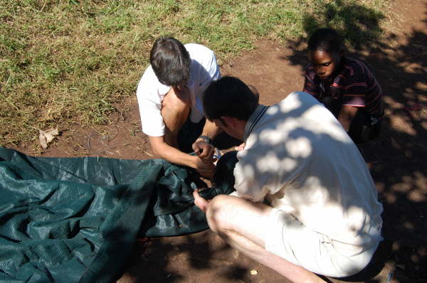 The filter is made from a 20 litre water container with holes drilled in it. Fine mesh netting is then wrapped around the water container to act a filter.
