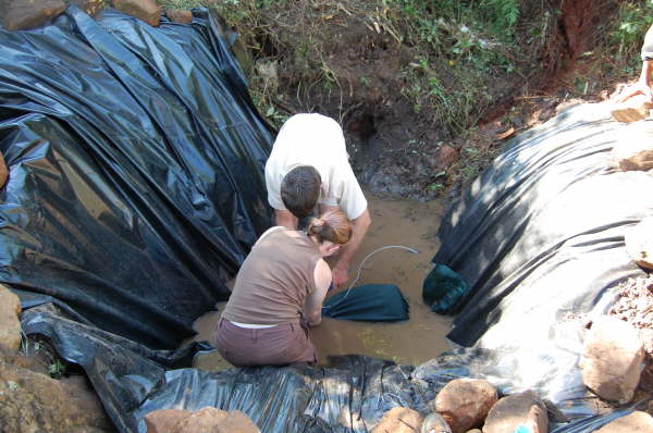 Fitting the filter to the plastic pipe.The water must run for 24 hours to ensure that it is clear before it can be fed into the tank.