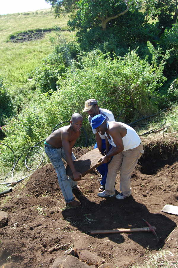 An area of land is chosen to site the tank. After an hour of hard work clearing the site of boulders and anything else that might puncture the tank it is realised that the top of the tank is above the eye of the stream - the tank will therefore never fill with water. |