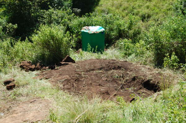 The tank at the bottom of the hill - awaiting the inflow pipe (tomorrow hopefully). Also shown, the site where the tank was going to be placed further up the hillside.