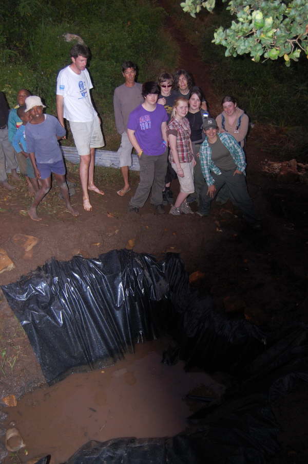 Late evening day 3.Shannon and Adrian have connected the pipe from the dam to the tank.The plan (after we've gone) is to have the reservoir covered and a fence put around it to keep large animals out.